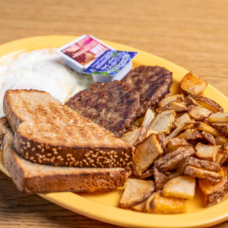 Two eggs**, choice of meat, breakfast potatoes OR fruit, w/ toast, English muffin or biscuit.